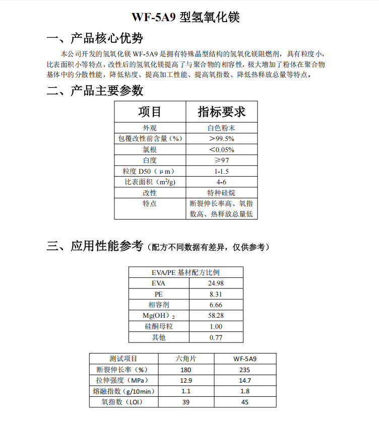 本公司开发的氢氧化镁 WF-5A9 是拥有特殊品型结构的氢氧化镁阻燃剂,具有粒度小,比表面积小等特点,改性后的氢氧化镁提高了与聚合物的相容性,极大增加了粉体在聚合物基体中的分散性能,降低粘度、提高加工性能、提高氧指数、降低热释放总量等特点。